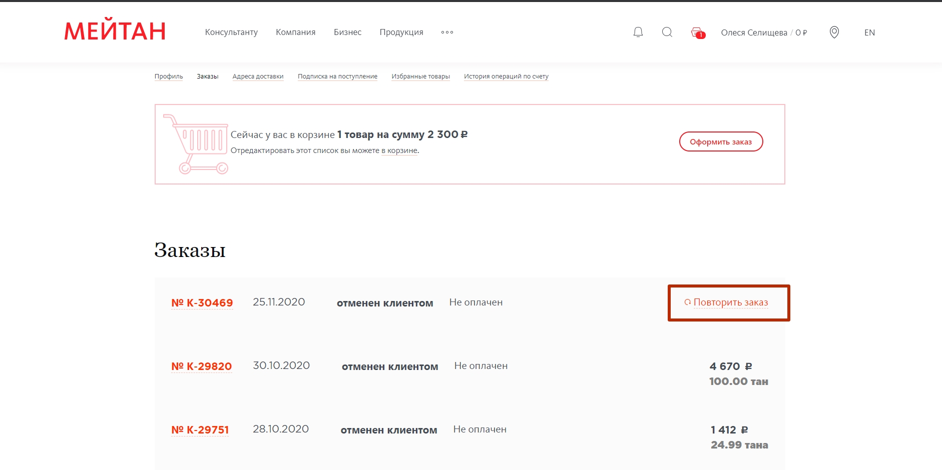 - повторить ранее созданный заказ.